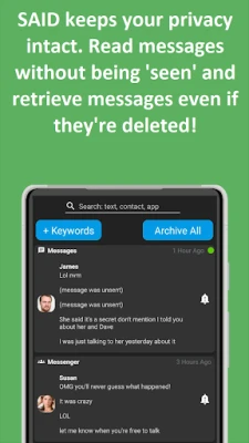 • Catch Deleted Messages: Missed a message that was deleted or unsent? SAID's smart technology allows you to capture and read these messages. Never be left out of the loop again.